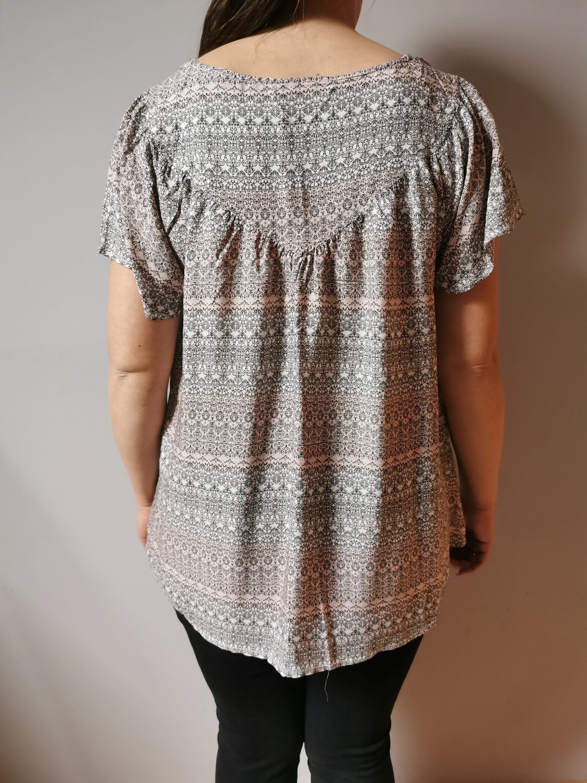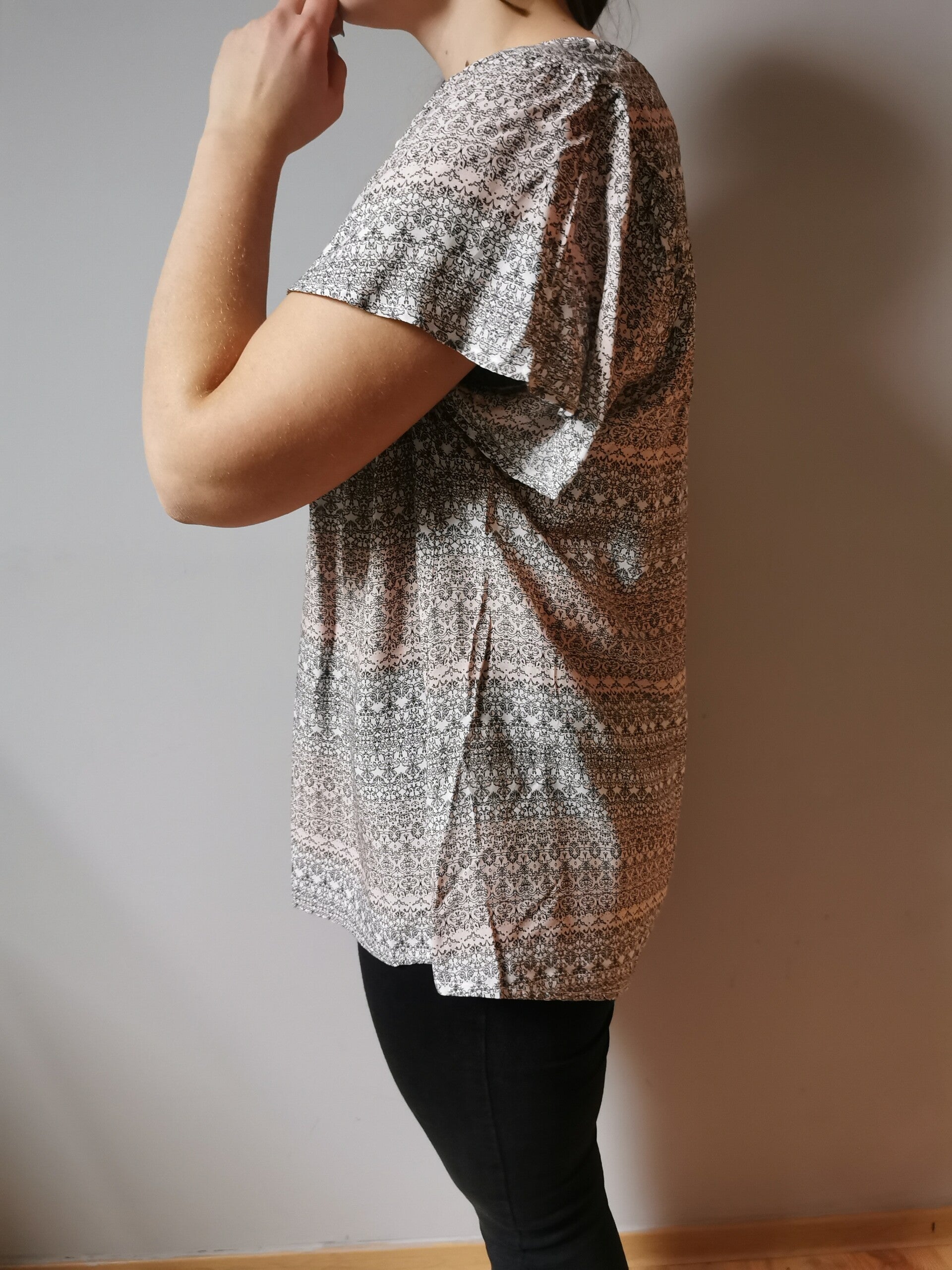 Bluzka z krótkim rękawem - motylek Gina r. 42 XL kolor pudrowy róż biały czarny wzorzysta